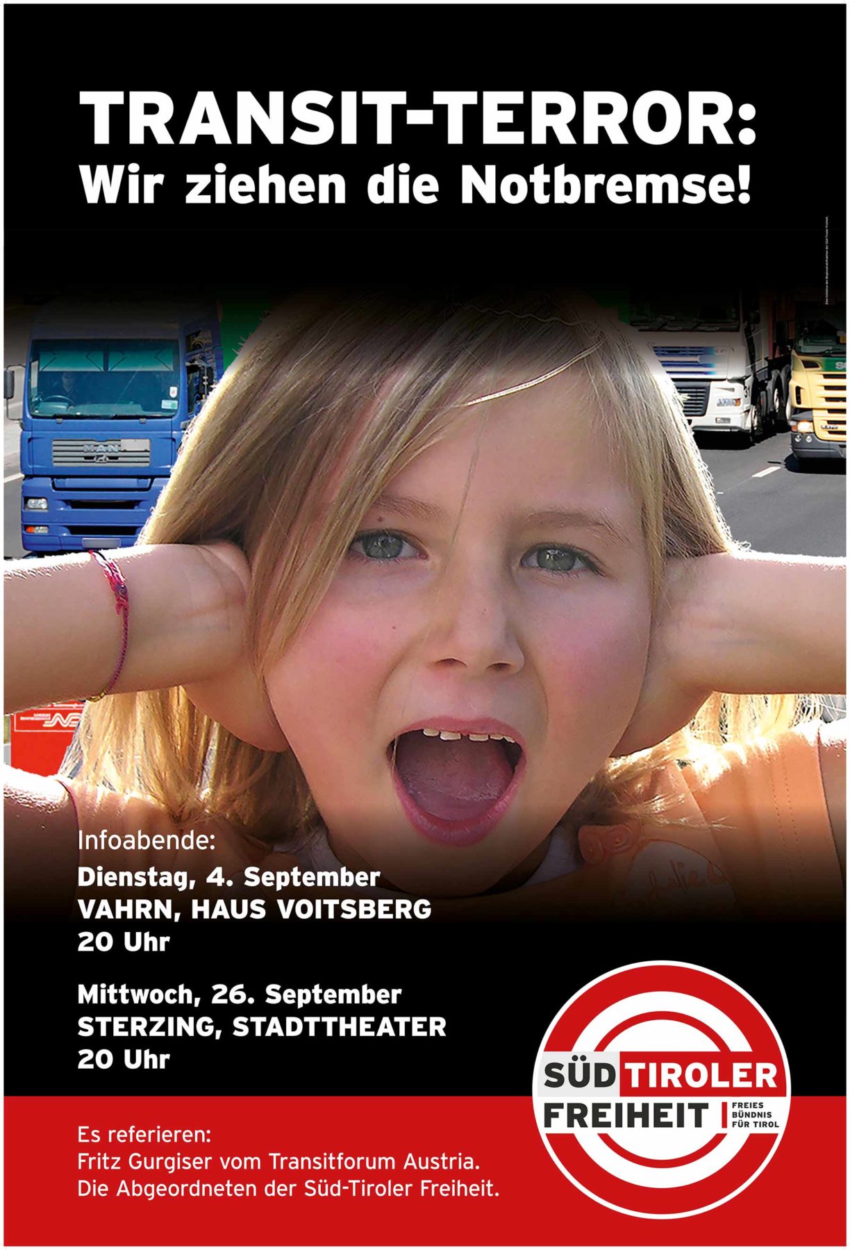 Am Dienstag, 4. September organisiert die Regionalratsfraktion der Süd-Tiroler Freiheit einen Informationsabend zum Thema „Transit-Terror – Wir ziehen die Notbremse“. Die Veranstaltung findet im Haus Voitsberg in Vahrn statt, Beginn 20 Uhr. Es referiert der Obmann des Transitforums Austria Tirol, Fritz Gurgiser, und die Regionalratsabgeordneten der Süd-Tiroler Freiheit, Sven Knoll, Bernhard Zimmerhofer und Myriam Atz Tammerle.