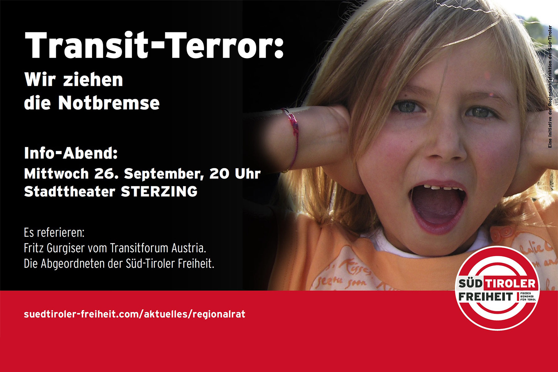 Die Regionalratsfraktion der Süd-Tiroler Freiheit lädt am Mittwoch, den 26. September mit Beginn um 20 Uhr ins Stadttheater Sterzing zum Info-Abend „Transit-Terror – Wir ziehen die Notbremse“, rund um die Problematik des Lkw-Transits im Wipp- und Eisacktal, ein.