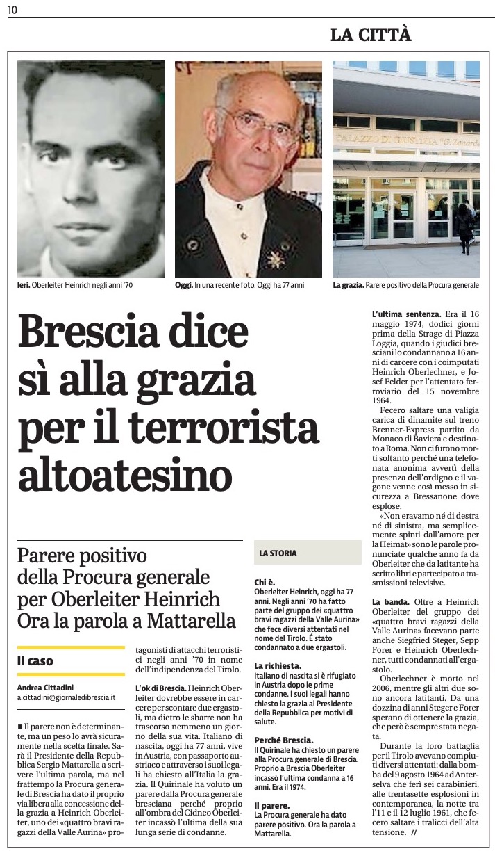 Die Süd-Tiroler Freiheit zeigt sich erfreut darüber, dass die Staatsanwaltschaft von Brescia dem Gnadengesuch des Süd-Tiroler Freiheitskämpfers Heinrich Oberleiter zugestimmt hat.