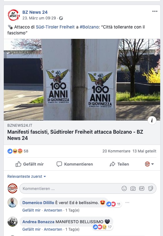 Zustimmung zur Plakat-Aktion kommt hingegen vom Bozner Gemeinderat der Casapound, Andrea Bonazza (siehe unten). Er bezeichnet das Plakat auf Facebook als „MANIFESTO BELLISSIMO“.