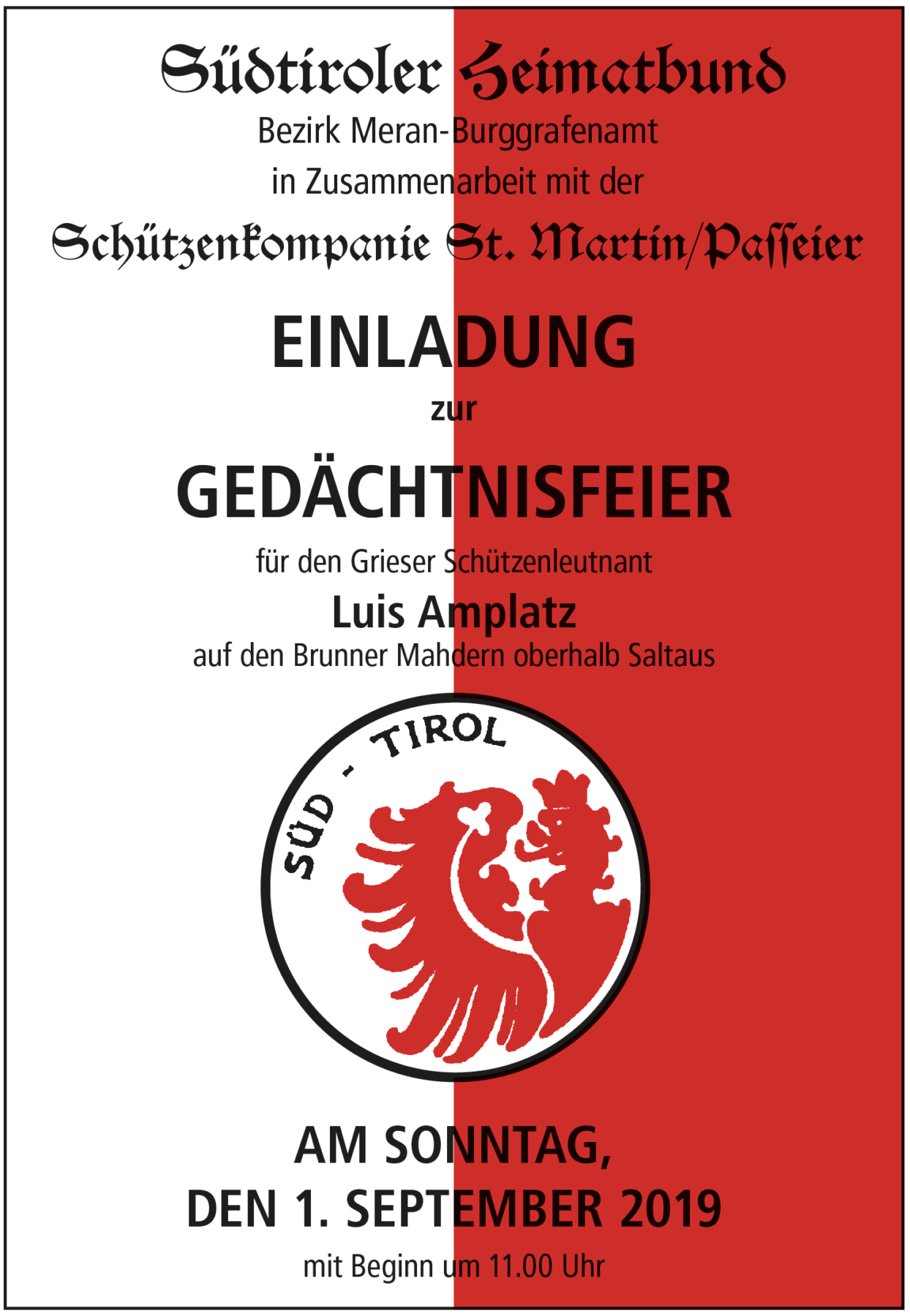 Der Südtiroler Heimatbund und der Bezirk Meran-Burggrafenamt laden in Zusammenarbeit mit der SK St. Martin in Passeier am Sonntag, den 1. September 2019 mit Beginn um 11 Uhr zur Gedächtnisfeier für den Grieser Schützenleutnant Luis Amplatz auf den Brunner Mahdern oberhalb Saltaus ein.
