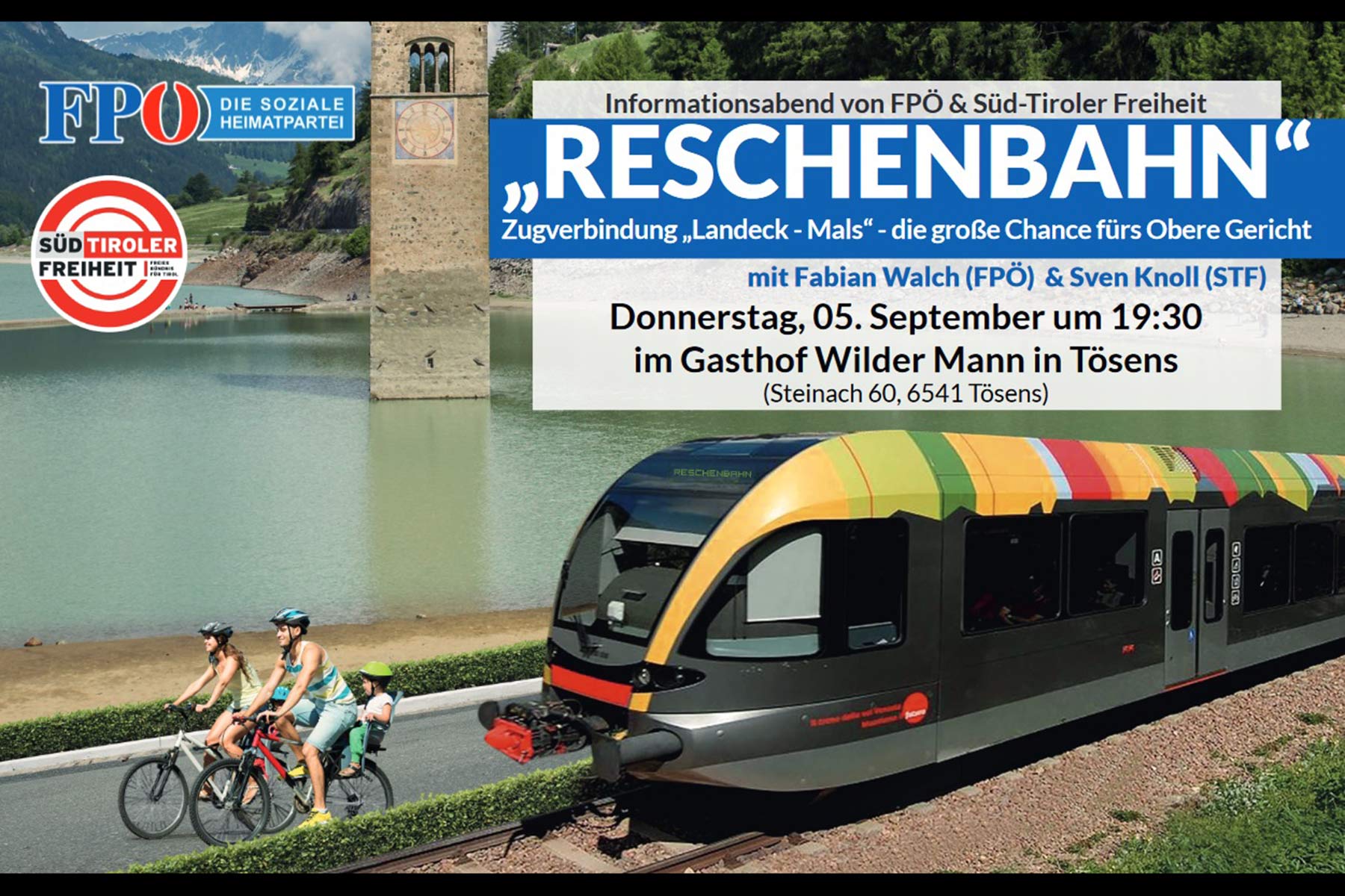 Wer sich für den Klimaschutz, die Verringerung der Verkehrsbelastung und die Förderung der heimischen Wirtschaft einsetzen möchte, darf nicht nur reden, sondern muss auch handeln. Die FPÖ Tirol und die Süd-Tiroler Freiheit setzten sich daher gemeinsam für die Fertigstellung der Zugverbindung von Landeck nach Mals ein, die ein ökologischer und ökonomischer Meilenstein für das gesamte Obere Gericht und den Vinschgau wäre. Um die Bevölkerung über den großen Nutzen der Reschenbahn zu informieren, wird diesen Donnerstag ein Informationsabend in Tösens organisieret.