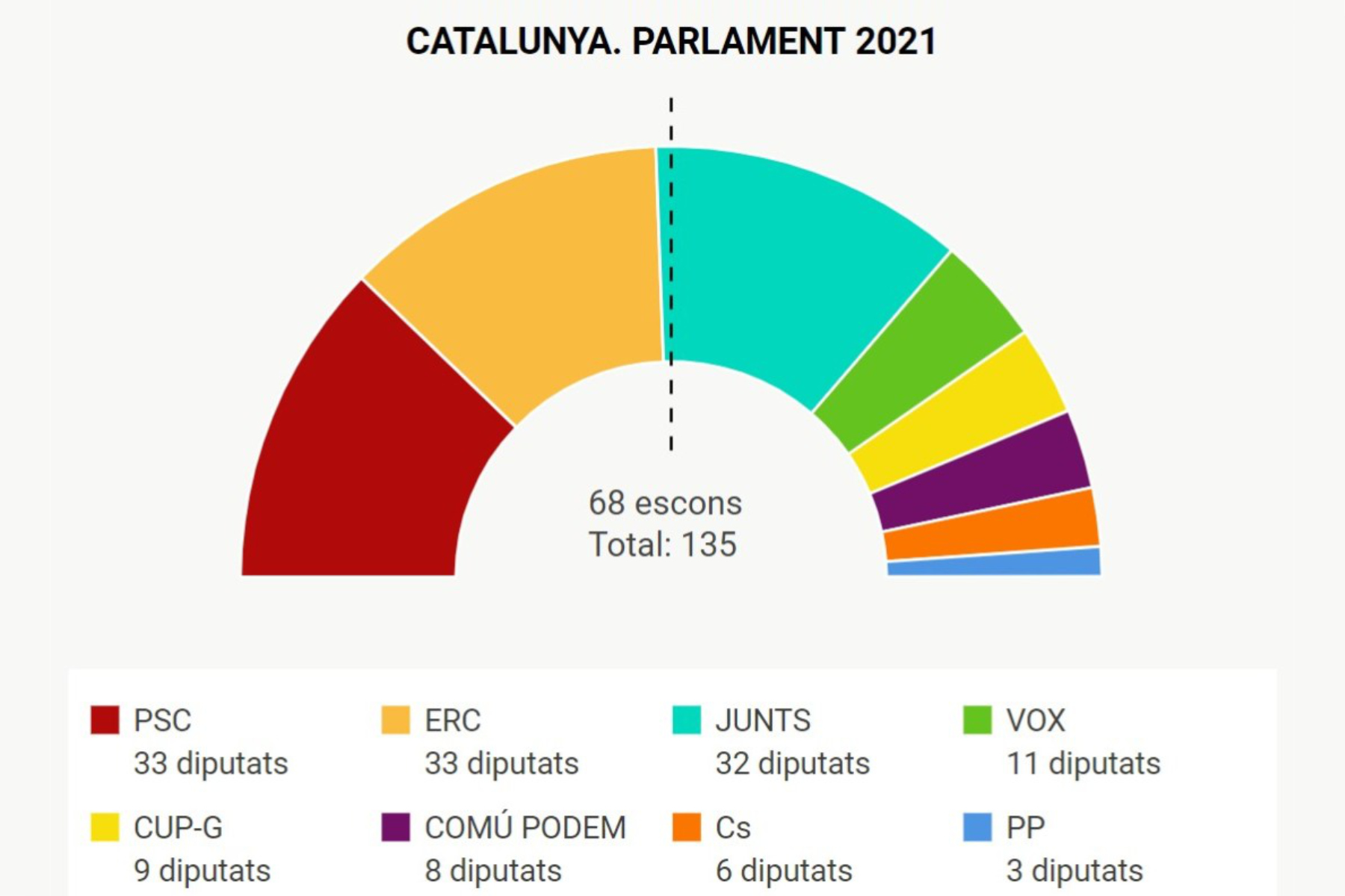 Von insgesamt 135 Sitzen gehen 76 Sitze an die drei Unabhängigkeitsparteien „Esquerra Republicana de Catalunya (ERC)“ (33 Sitze), „Junts“ (32 Sitze) und „Candidatura d’Unitat Popular (CUP)“ (neun Sitze). Die Unabhängigkeitsparteien sind damit fortan mit vier Sitzen mehr als bisher im katalanischen Parlament vertreten und verfügen somit über eine noch größere Mehrheit als in all den Jahren davor.