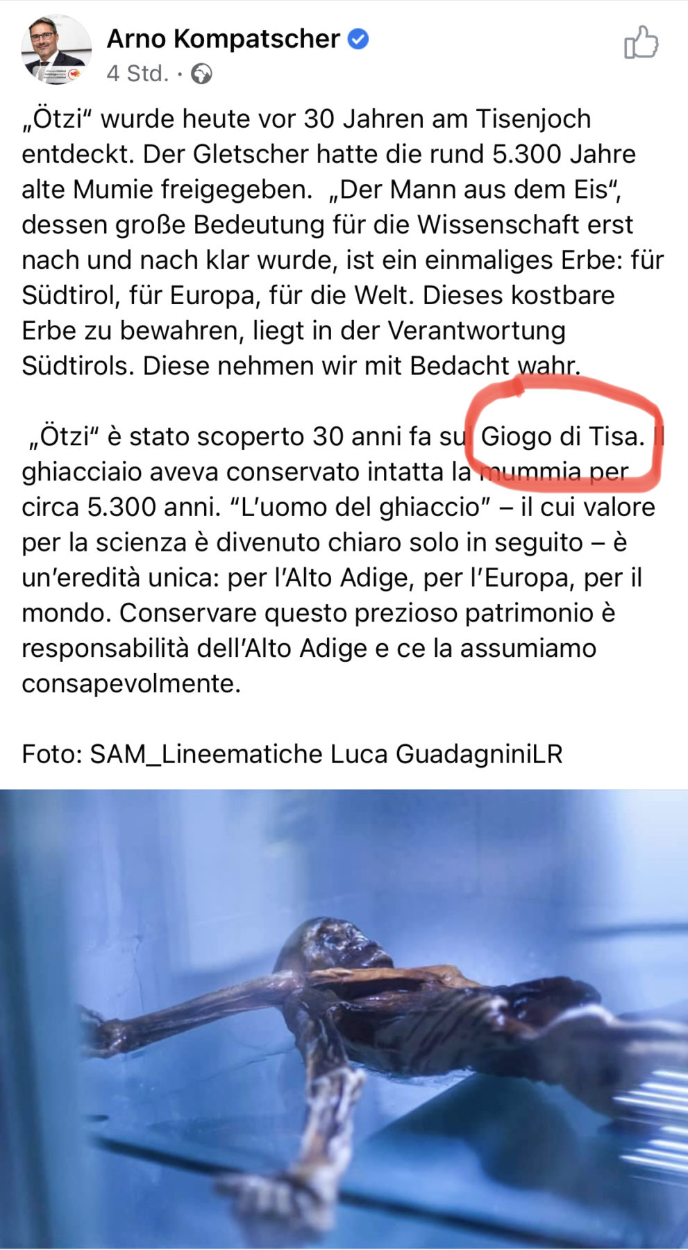 Wenn Landeshauptmann Kompatscher nun aber diese zusätzliche Erfindung selbst verbreitet und aus der Ötzi-Fundstelle am Tisenjoch ein „Giogio di Tisa“ macht, untergräbt er damit alle politischen Bemühungen zur Abschaffung der faschistischen Begriffe, die nicht einmal die Italiener kennen und benutzen.