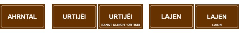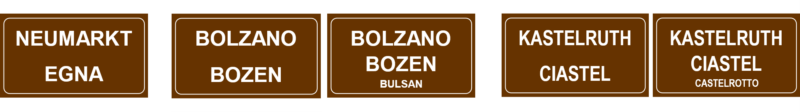 1. Einsprachige Gemeinden führen auf der Ortstafel grundsätzlich den Gemeindenamen in ihrer Sprache an, d.h. deutsch bzw. ladinisch. Auf Wunsch der Gemeinde kann auch der Name in der zweiten bzw. dritten Sprache in kleinerer Schriftgröße auf der Ortstafel hinzugefügt werden. Beispiele: