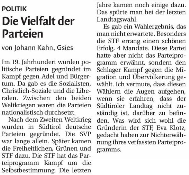 Johann Kahn hat offensichtlich die Werbebroschüre der Bewegung Süd-Tiroler Freiheit anlässlich der letzten Landtagswahl nicht gelesen. Punkt eins darin ist die Selbstbestimmung, unser Hauptanliegen! Dann folgen die Punkte Autonomie, Ausländer & Sicherheit, leistbares Leben, Demokratie, Gesundheit, Verkehr & Umwelt.